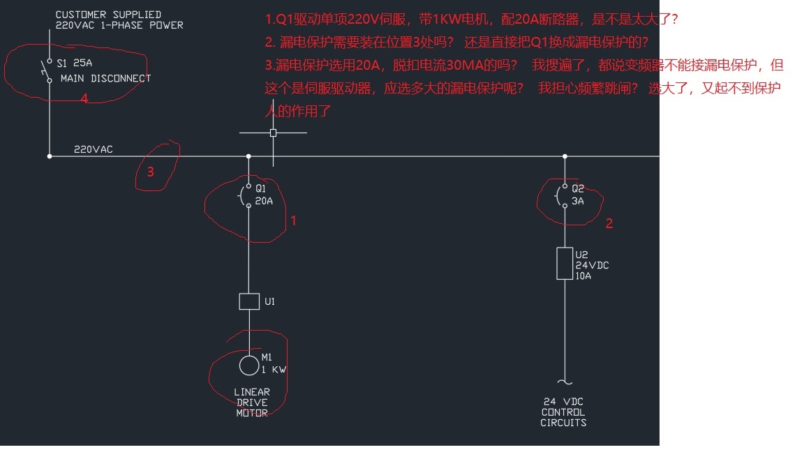 1.Q1空氣開關(guān)驅(qū)動單項220V伺服,帶1KW電機,配20A斷路器,是不是太大了?
