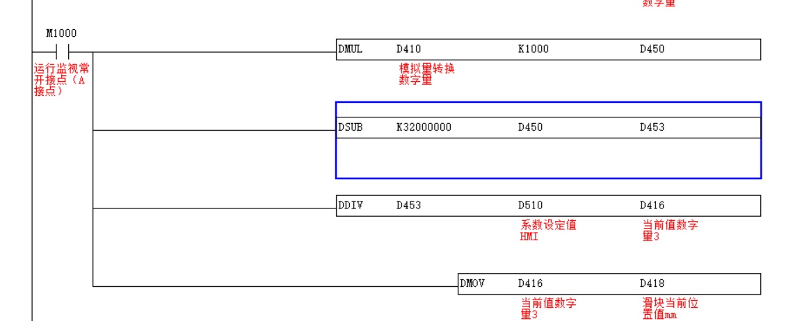D410為模擬量轉(zhuǎn)換后的數(shù)字量。0-32000 。D450放大1000倍暫存。