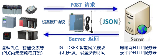 智能網關IGT-DSER集成了多種PLC的原廠協議,方便實現各種PLC與服務端之間的HTTP協議通訊,通過網關的參數配置軟件綁定JSON文件的字段與PLC寄存器地址,配置URL,選定周期模式或者觸發模式,即可通過POST命令,將JSON文件提交給HTTP的服務端; 如果服務端有返回的JSON,網關進行解析后將數據寫入到PLC,實現PLC與HTTP服務端雙向通訊。 網關模塊詳細資料