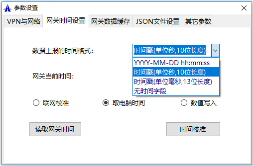 上報到服務端的JSON默認會帶一個上報時間字段,根據上圖可修改字段名稱,同時也可以選擇時間格式,通過'參數'->'校準網關時間',打開以下窗口:
