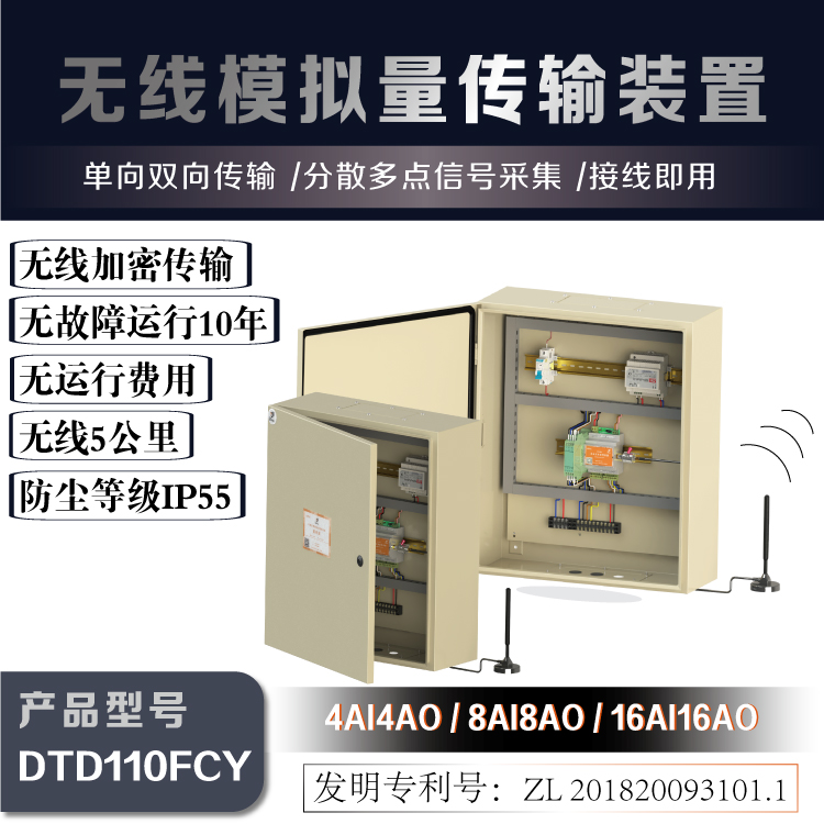 達泰1系無線模擬量傳輸裝置-DTD110FCY,可直接替代有線模擬量信號傳輸方式,實現4-20mA或0-5V電壓信號的點對點無線傳輸功能。無線裝置無需編程,運用全數字無線加密傳輸方式保證數據安全可靠,傳輸距離在3-10公里,后期無運行費用,配置防雨機箱,防護等級IP55。無線通訊裝置發射端能夠提供1-4路模擬信號輸入(信道數可以定制),可以直接連接變送器,傳感器,PLC等設備;接收端能夠提供1-4路模擬信號輸出(信道數可以定制),可以直接連接數顯表,DCS,PLC等設備,發射端與接收端成套使用。在使用時,外接220V電源并接入對應信號線即可實現模擬量信號的無線通訊。
