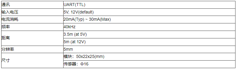 超聲波傳感器用于感測距離是由于超聲波指向性強,能量消耗緩慢,在介質中傳播的距離較遠,因而超聲波經常用于距離的測量,如測距儀和物位測量儀等都可以通過超聲波來實現。利用超聲波檢測往往比較迅速、方便、計算簡單、易于做到實時控制,并且在測量精度方面能達到工業實用的要求。下面工采網小編和大家一起看看看如何提高測距精度的超聲波傳感器模塊的方法。 超聲波測距是通過不斷檢測超聲波發射后遇到障礙物所反射的回波,從而測出發射和接收回波的時間差t,然后求出距離S=V t/2,式中的V為超聲波波速。由于超聲波也是一種聲波,其聲速C與溫度有關,在使用時,如果溫度變化不大,則可認為聲速是基本不變的。如果測距精度要求很高,則應通過溫度補償的方法加以校正。超聲波測距模塊是用來測量距離的一種產品,通過發送和收超聲波,利用時間差和聲音傳播速度,計算出模塊到前方障礙物的距離。工采網提供的韓國Hagisonic 超聲波測距傳感器模塊 - HG-C40U是一款尺寸為50x22x25(mm)、Φ16傳感器的模塊,可測量到障礙物的最大距離為3.5m (at 5V)、5m (at 12V),分辨率在5mm以內。 HG-C40U 還具備兩個輸入電壓:5V 和 12V。出廠默認設為 12V。通訊方面采用UART通訊發送數據,在UART 觸發模式下,如果出發命令由 UART 生成,則僅發送數據,發送: #Mode|2 (變為外部觸發模式),接收:!Mode|2 -> !Data Set Complement。信號輸出則將傳感器到PC的通訊使用‘接口板’(RS232,功率調節器)數據顯示使用PC上的監控程序(可用超級終端),高性能ASIC芯片,保證穩定傳輸、靈敏接收。 韓國Hagisonic 超聲波測距傳感器模塊 HG-C40U參數: |