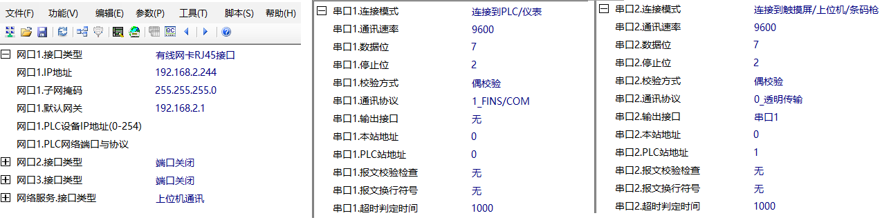 智能網關的串口1接歐姆龍PLC,串口2接觸摸屏;通過網口對接西門子S7-1500的PLC(IP地址:192.168.2.111)。打開智能網關的參數設置軟件(軟件下載),先設置智能網關模塊的網口和串口參數,設置好的參數如下圖: