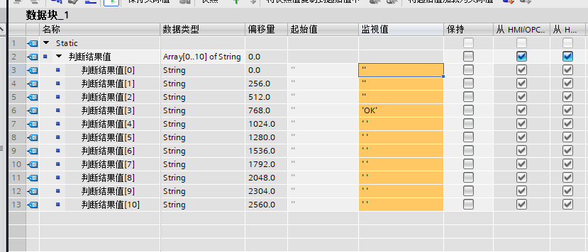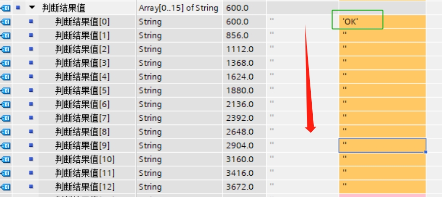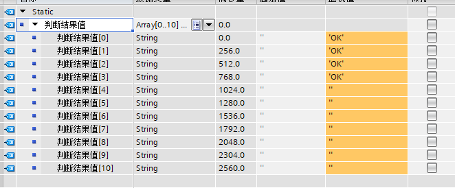 #R_TRIG_01(CLK := ("觸發")); IF #R_TRIG_01.Q THEN #i := 0; #j := 0; FOR #i := 0 TO 10 DO IF "數據塊_1".判斷結果值[#i]='OK' THEN #j := #i; END_IF; END_FOR; "數據塊_1".判斷結果值[#j] := ''; "數據塊_1".判斷結果值[#j + 1] := 'OK'; END_IF; 我想了個這個辦法 for循環遍歷一下,找到那個i 賦值給j,然后在改你字符串內容  |