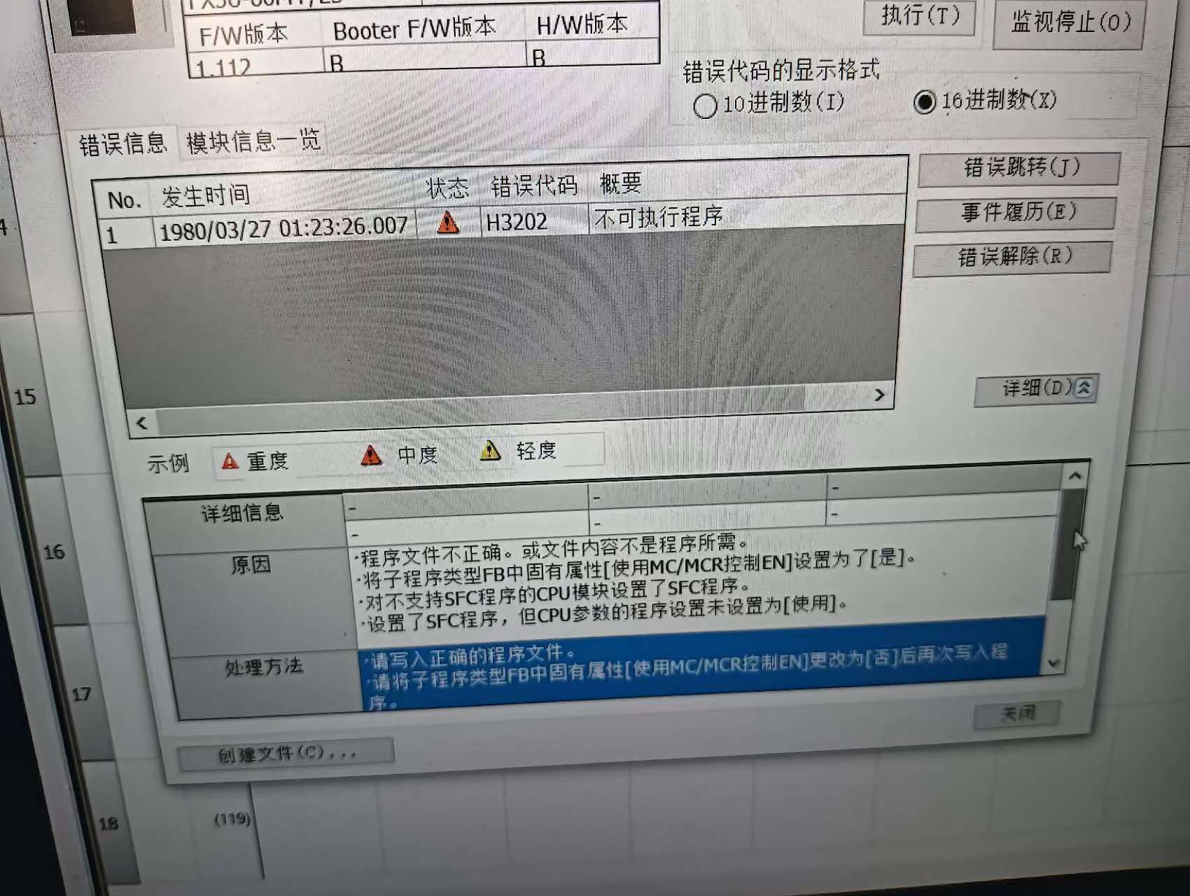 現場有一臺fx5u的plc.時不時就出現莫名其妙的停機。其他同事沒在意,以為是網線的問題,導致通訊不上。后來換幾次網線,還是出現問題。有一天出現了停機。就拿電腦過去監控一下。經過診斷,提示意思說不支持mc mcr功能,看功能塊也沒有調用sfc功能,后來打電話問下三菱技術,最終確認是固件版本低的問題。找采購聯系代理,代理發過來一個固件升級包。