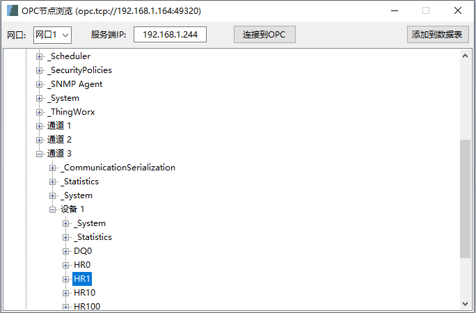 數(shù)據(jù)標(biāo)簽可手動輸入添加,也可以通過CSV文件導(dǎo)入導(dǎo)出,文件菜單內(nèi)有相關(guān)功能按鈕;還可以通過‘編輯’->‘OPC節(jié)點(diǎn)瀏覽’瀏覽標(biāo)簽后,點(diǎn)右上角的‘添加到數(shù)據(jù)表’,如下圖: