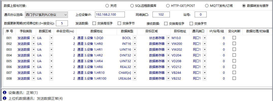 然后通過‘功能’->‘?dāng)?shù)據(jù)上報與平臺對接’,選擇‘專用協(xié)議數(shù)據(jù)通訊’,進(jìn)入以下頁面配置發(fā)送數(shù)據(jù)(OPCUA發(fā)送到PLC的數(shù)據(jù))、接收數(shù)據(jù)(OPCUA服務(wù)端接收來自PLC的數(shù)據(jù)) ,以及PLC的IP地址,端口(102)等參數(shù)。