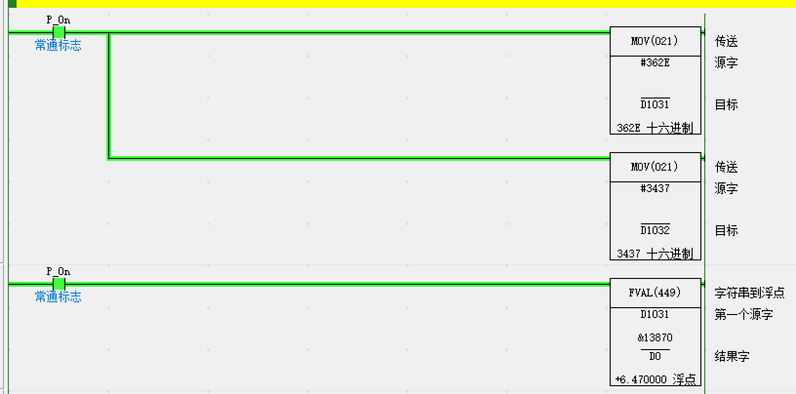 大佬們,接觸了半年的歐姆龍cp系列plc,想問一下下面鏈接里面的圖,其中D1031和D1032,16進制的值為362E,3437,用ASCLL碼轉換為就是6.47,就是這個6.47是兩個地址,能用什么辦法把它變為一個地址,或者讓一個地址直接顯示為浮點數6.47嗎