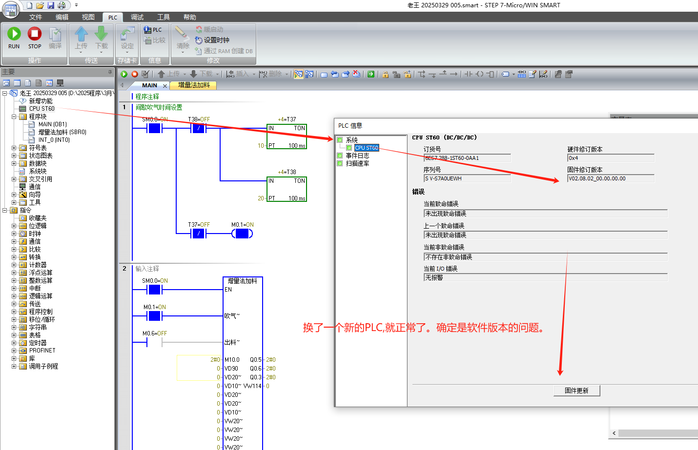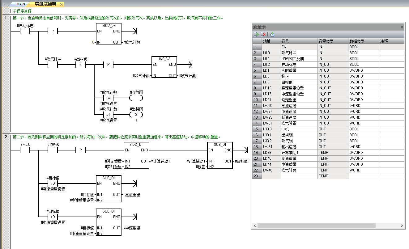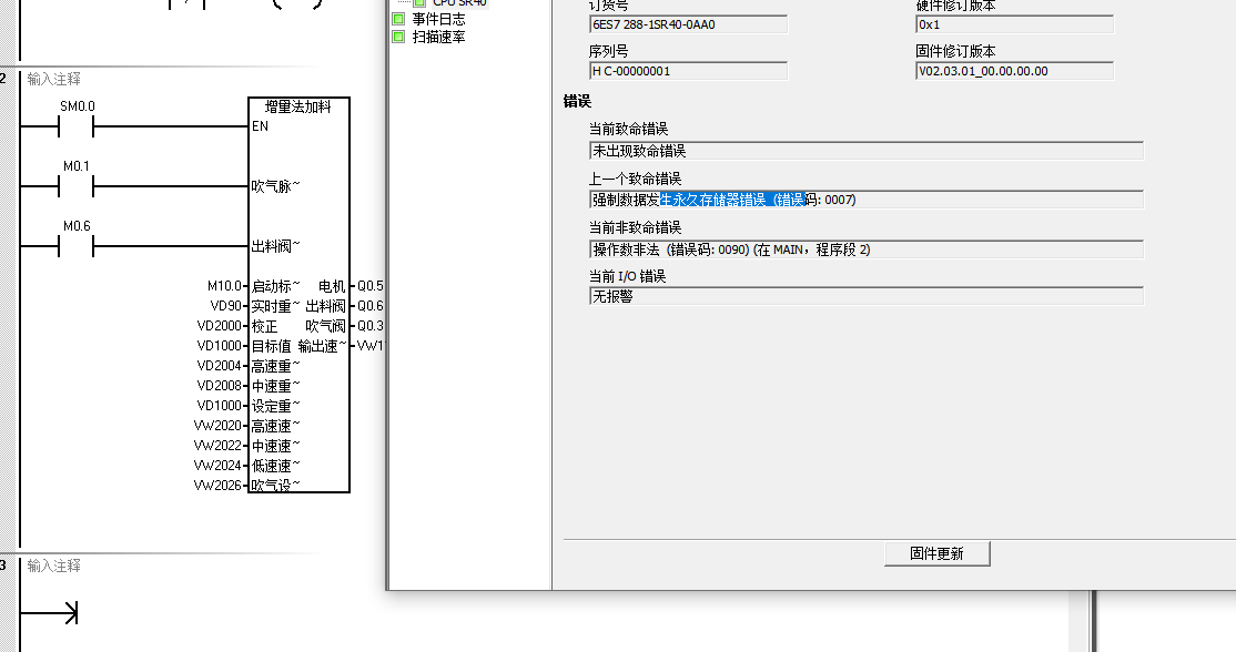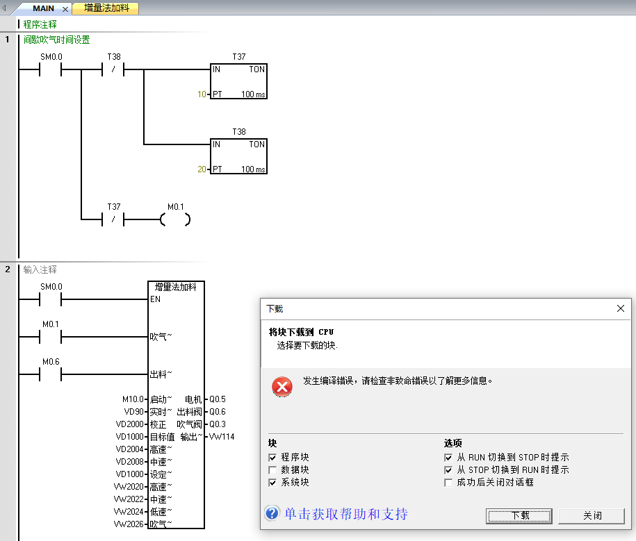 SAMRT200,做了多段速加料的程序塊應用。控制過程都有備注。編譯時都是正常的,下載則報錯了,也沒找出原因。后來,我把子程序的程序刪除,保留變量定義。下載,也是報同樣的錯誤。各位朋友,這是出錯在哪兒呢?!