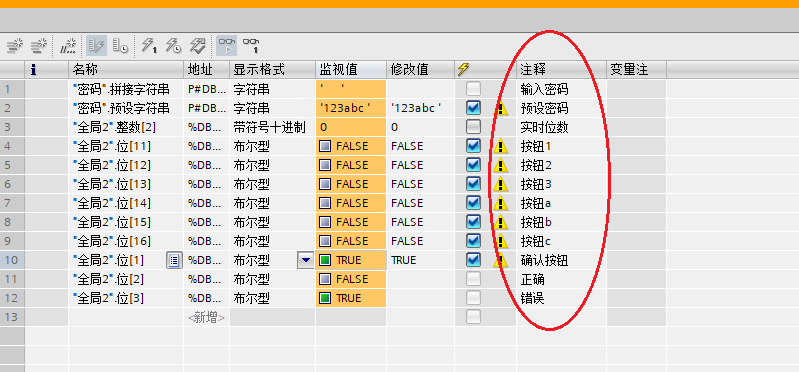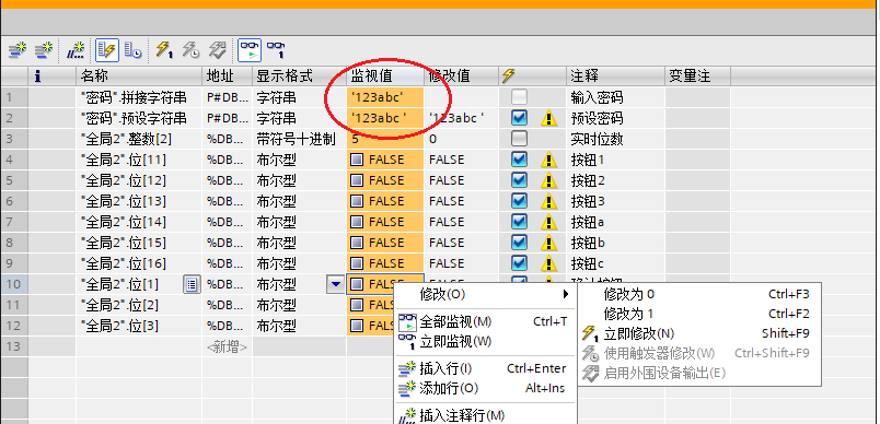 字符串由多個字符組成,每個字符占1個字節;一般以ASCII碼形式存儲,可以存儲字母、數字和常見符號等。而字符串在我們DB中占據的空間還不小,默認有256個字節。它理論可以存256個字符(其實有2個是用來存長度和數量的)。類比我們每個漢字是占2個字符的,如果你名字是三個字,存到里面占6個字節。但是博途中不提倡用漢語,如果工程中用字符串存儲,最好用英文,這一點知曉就行。