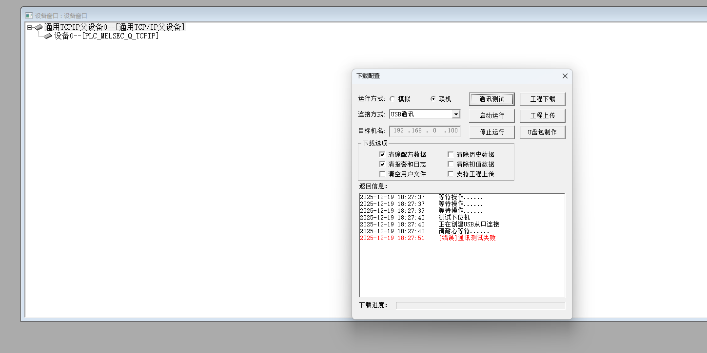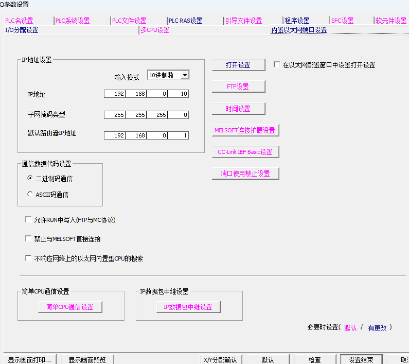 三菱Q03UDV的CPU用內置以太網連接MGCS做仿真通訊,電腦IP192.168.0.100,PLC設置IP為:192.168.0.10,為什么會通訊失敗,還有哪里需要設置的,切換到使用USB連接也通訊不上