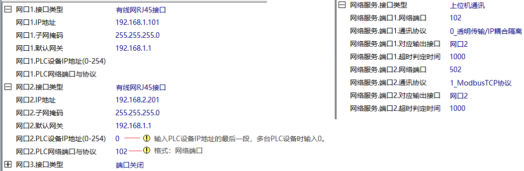 打開網關參數設置軟件(在附件中),通過'功能'->'類型與設備選擇'選擇第三個類型,PLC設備選擇西門子S7-1200/1500,點'確定當前選擇'、'參數寫入到網關',根據提示重啟。重啟讀取參數后,確認跟之前所選擇的一致,再通過'功能'->'網口參數編輯'編輯網口參數。以下是網關的網口參數配置截圖: