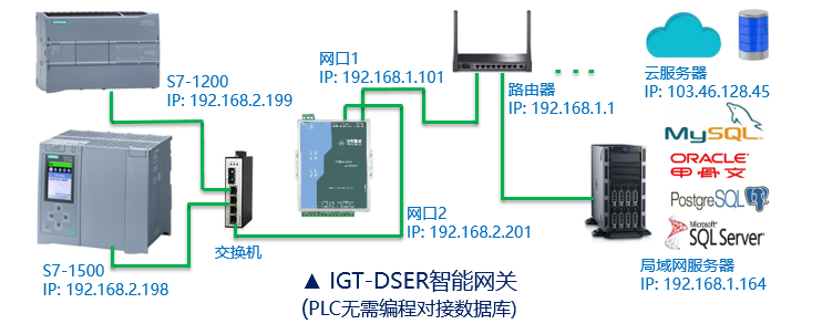 以下是通過數據庫智能網關IGT-DSER實現S7-1200/1500系列的PLC與數據庫服務器雙向通訊,網關支持MySQL和SQLServer、PostgreSQL,以及Oracle、達夢數據庫等。這里選擇的是Oracle。實際網絡結構如下圖:
