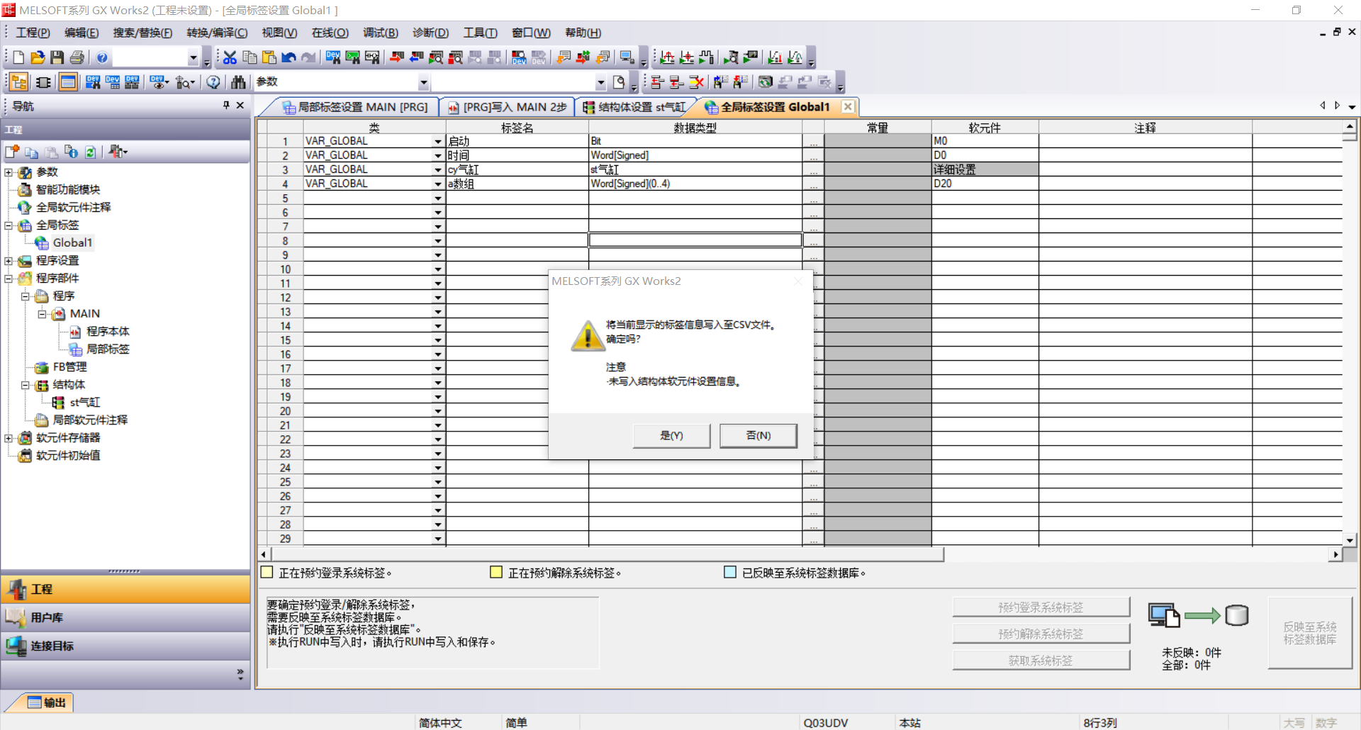 這是GX WORKS2的標(biāo)簽導(dǎo)出,結(jié)構(gòu)體標(biāo)簽是導(dǎo)出不了的,而且普通標(biāo)簽?zāi)阆雽?dǎo)出也要手動給每個標(biāo)簽分配絕對地址,不然導(dǎo)出不了。
