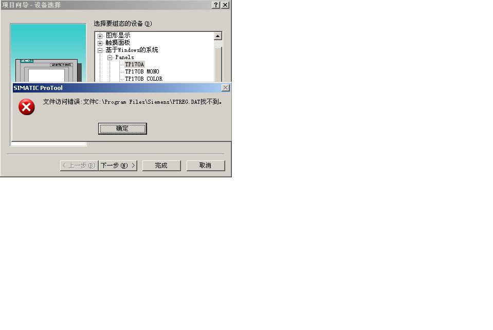 版主,偶時第一次使用西門子觸摸屏軟件PROTOOL6.0的,為何新建項目時為何提示 ' 文件訪問錯誤:文件C:\Program Files\Siemens\PTREG.DAT找不到' ;謝謝~~