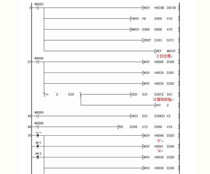 這些語句是送入通信數據,MOV H0005 D200 表示把ASCII碼“ENQ”送入D200,MOV H0030 D201 表示把ASCII碼“0”送入D201,MOV H0030 D202 表示把ASCII碼“0”送入D202,這是變頻器站址。以上是根據三菱變頻器的通信協議來理解的。