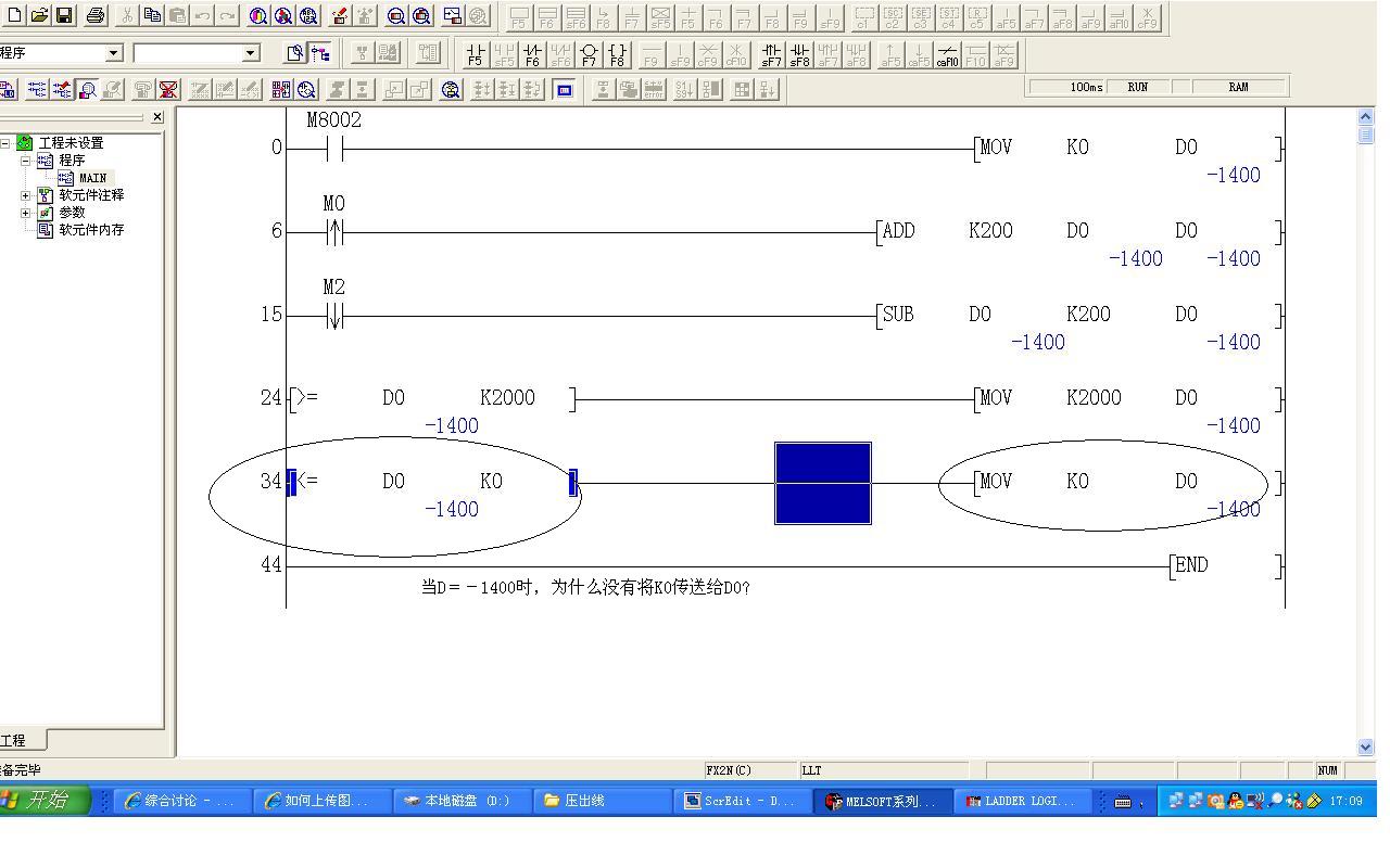 我用三菱軟件模擬時,為什么當D0<=0時不能使D0=0?見圖:
