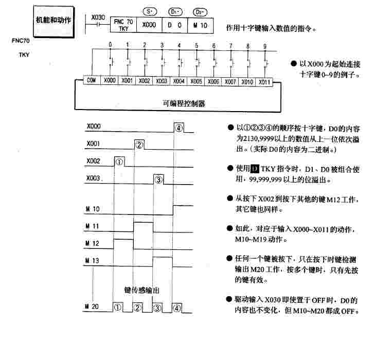 一個編碼功能,一個輸入點代表一個數字,X0=0,X1=1,……,X10=8,X11=9,把這個數字用二進制表示,為0000~1001,用Y0~Y3輸出