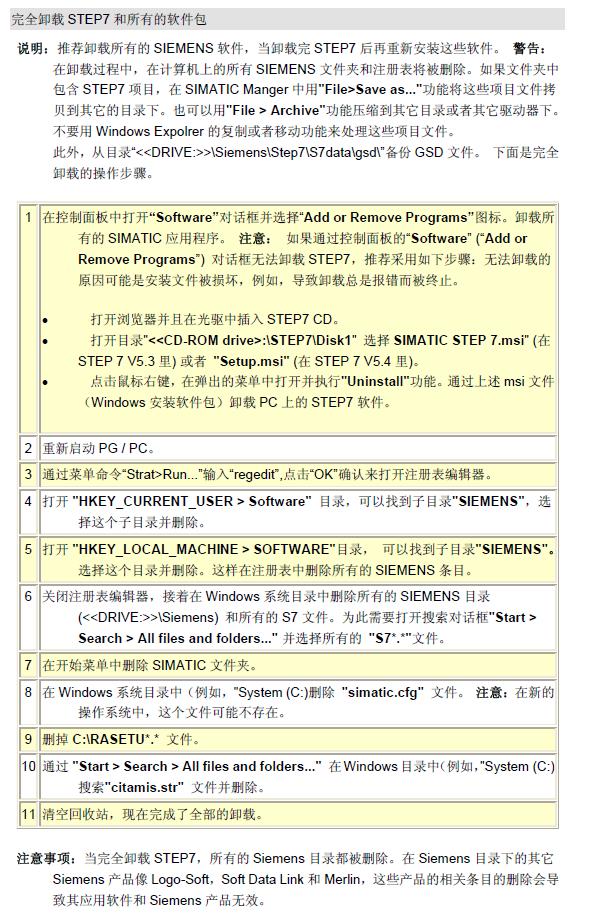 你可以修改注冊表,我也碰到過,沒有卸載干凈,就會出現這樣的問題,在命令行中輸入 regedit,點擊OK進行確認。保存當前注冊表設置,選中“My Computer”并通過 File > Export....保存注冊表數據。 打開目錄 HKEY_LOCAL_MACHINE\ Software\ Microsoft\ Windows\ CurrentVersion\ Uninstall。 選中目錄 Uninstall,通過Edit > Find....打開查找對話框 。 在“Find what:”欄輸入STEP 7-Micro/WIN 并選中所有 “Look at”選項。 點擊 Find Next 按鈕開始搜索。注冊表條目取決于所安裝 STEP 7 Micro/WIN 的版本。為了確保找到正確的注冊表條目,請確保 “DisplayName” 代碼值要與表 1中 “MicroWin Release” 列的值匹配 (例如: STEP 7 Micro/WIN V4.0 的 DisplayName 代碼是 SIMATIC STEP 7-Micro/WIN V4.0.0.81)。 選中含有帶正確數值的 DisplayName 代碼所在的文件夾,從注冊表目錄 HKEY_LOCAL_MACHINE\ Software\ Microsoft\ Windows\ CurrentVersion\ Uninstall 中刪除