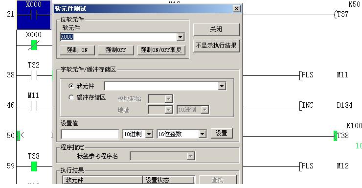 在樓主那個狀態下,點擊鼠標左鍵到你想要模擬按鈕動作的觸點上,再點擊鼠標右鍵彈出下拉菜單,選“軟元件測試”,彈出“軟元件測試”對話框,如圖所示,你想強制ON也好,強制OFF也好,就看你的程序了!  [attachment=29903]